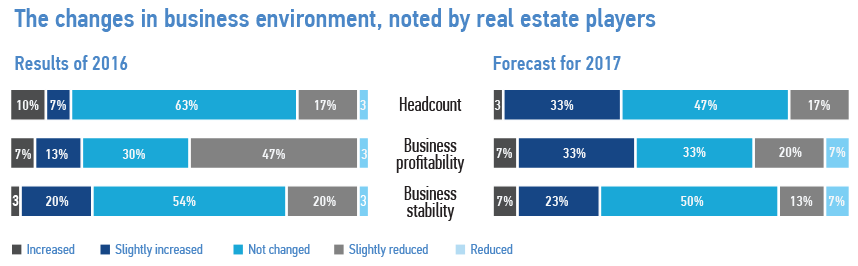According to results of 2016, almost half of the respondents (47%) noted the decline of the business profitability. Only third part of the intervieees forecast its growth in 2017. Interestingly that 13% recorded little growth during the year.