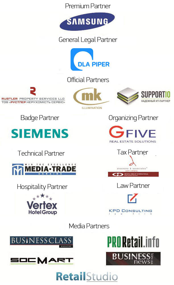Alacor, ArricanoCommercialRealEstate, «ÕÕI Century», «Piramida» Trade Centre, «Status Development», 1849 plc, AVECGROUP, Auchan, DLAPiperUkraine, DragonCapitalRealEstateAdvisory, DreamTown Trade Centre, EASTGATEDEVELOPMENT, ESTAHolding, GlobalEstate, HOMELAND, IMMOCHANUkraine, MeyerBergman, MFU, MTI, MultiDevelopment, RetailSystems, RustlerPropertyServices, UTG, «Inditex», «KAN Development», «Karavan» Trade Centre, Maratex and many others.