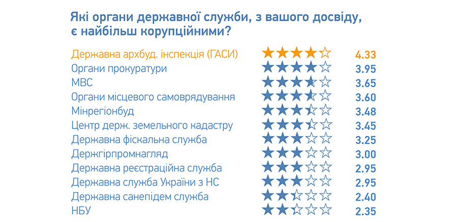 Найчастіше з випадками корупції респонденти зустрічаються у Держархбудконтролі, при роботі з органами прокуратури, МВС, а також органами місцевого самоврядування та Мінрегіонбудом. В цілому, учасниками опитування тією чи іншою мірою були відзначені всі запропоновані для оцінки органи державного контролю, включно з МНС, службою земельного кадастру та державною службою реєстрації.