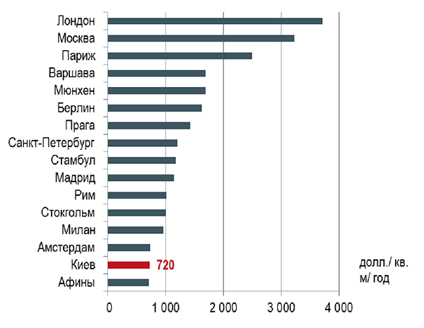 Відсутність введення при стійкості попиту сформували умови для стабілізації орендних ставок. Максимальна орендна ставка на ринку торгових центрів Києва склала 720 дол. За кв. м в рік (60 дол. за кв. м в міс.)