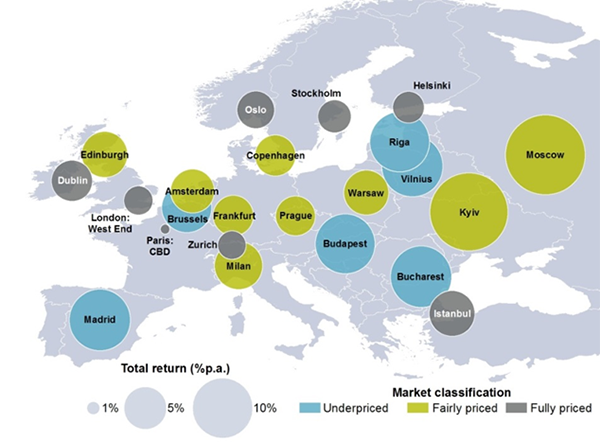 Самая высокая доля недооцененных рынков и, соответственно, рост привлекательных для инвесторов возможностей, были зафиксированы в странах Центральной и Восточной Европы, периферийных рынках Еврозоны и странах Балтии. Большинство рынков Германии и 19 рынков Великобритании названы справедливо оцененными. В то же время Швейцария остается непривлекательной для инвестирования в связи с очень низкими ставками доходности на объекты наилучшего качества (3.0-3.5%) и слабым потенциалом роста арендных ставок.