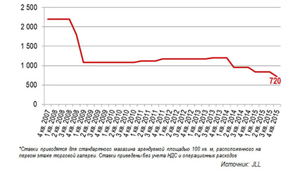 За оцінками експертів компанії JLL, верхня межа орендних ставок в якісних торгових центрах Києва знизилася в 2015 році на 25% і досягла за підсумками 4-го кварталу 720 дол. за кв. м в рік (без урахування ПДВ і операційних витрат) проти 960 дол. на кінець 2014 року і 1,2 тис. дол. на кінець 2013 року. Дана динаміка пояснюється девальвацією національної валюти, що сталася на початку 2015 року, і посиленням тиску на власників об'єктів з боку орендарів.