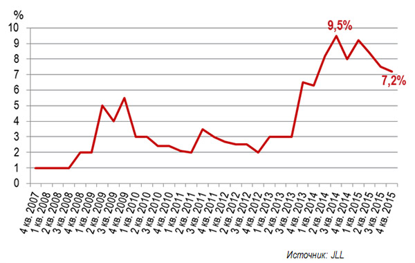 Частка вакантних площ у київських ТРЦ за 4-й квартал знизилася на 0,3 п.п. і на 0,8 п.п. в цілому за рік - до 7,2%. Подальша динаміка показника залежить від того, які торгові центри будуть відкриті в 2016 році. «За нашими оцінками, при існуючому рівні попиту в разі відкриття всіх заявлених на поточний рік об'єктів частка вільних площ на ринку торгових центрів Києва досягне 11-11,5%», - коментує Мар'яна Супчан, аналітик відділу досліджень компанії JLL (Україна).