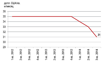 Максимальная ставка аренды на рынке офисной недвижимости сократилась в 3-м квартале 2014 с 396 до 370 долл. за кв. м в год (31 долл. за кв. м в мес.), что связано с низким уровнем спроса на офисные помещения в Классе А. Большинство сделок, закрытых в прошедшем квартале Классе А, были начаты задолго до макроэкономической и политической нестабильности в стране.