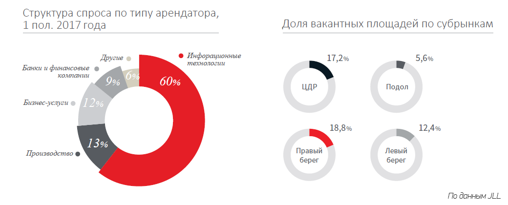 Объем сделок аренды в 1 пол. 2017 года составил 90,5 тыс. кв. м, из которых 54,2 тыс. пришлось на 2 кв. Основной спрос в 2017 году наблюдается со стороны IT-компаний. Доля этого сектора в структуре совершенных в 1 пол. 2017 года сделок аренды достигла наибольшего значения за всю историю и составила 60%.