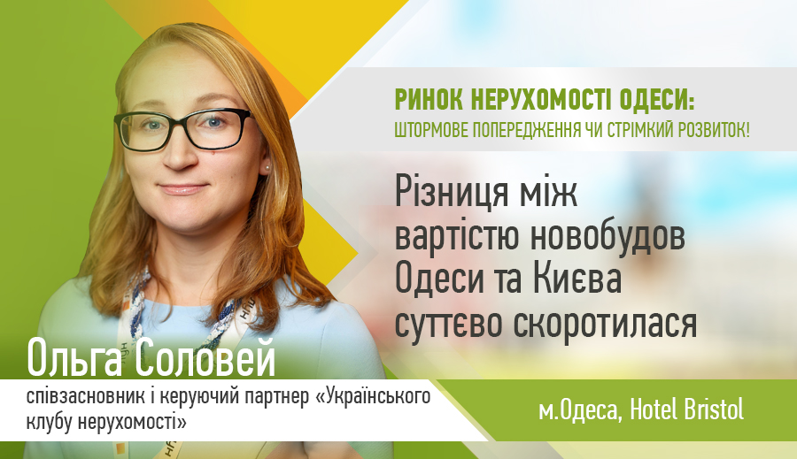 Різниця між вартістю житла на первинному ринку Одеси та Києва суттєво знизилася. Про це на Форумі «Ринок нерухомості Одеси: штормове попередження чи стрімкий розвиток» повідомила Ольга Соловей, співзасновник і керуючий партнер «Українського клубу нерухомості» (URE Club).