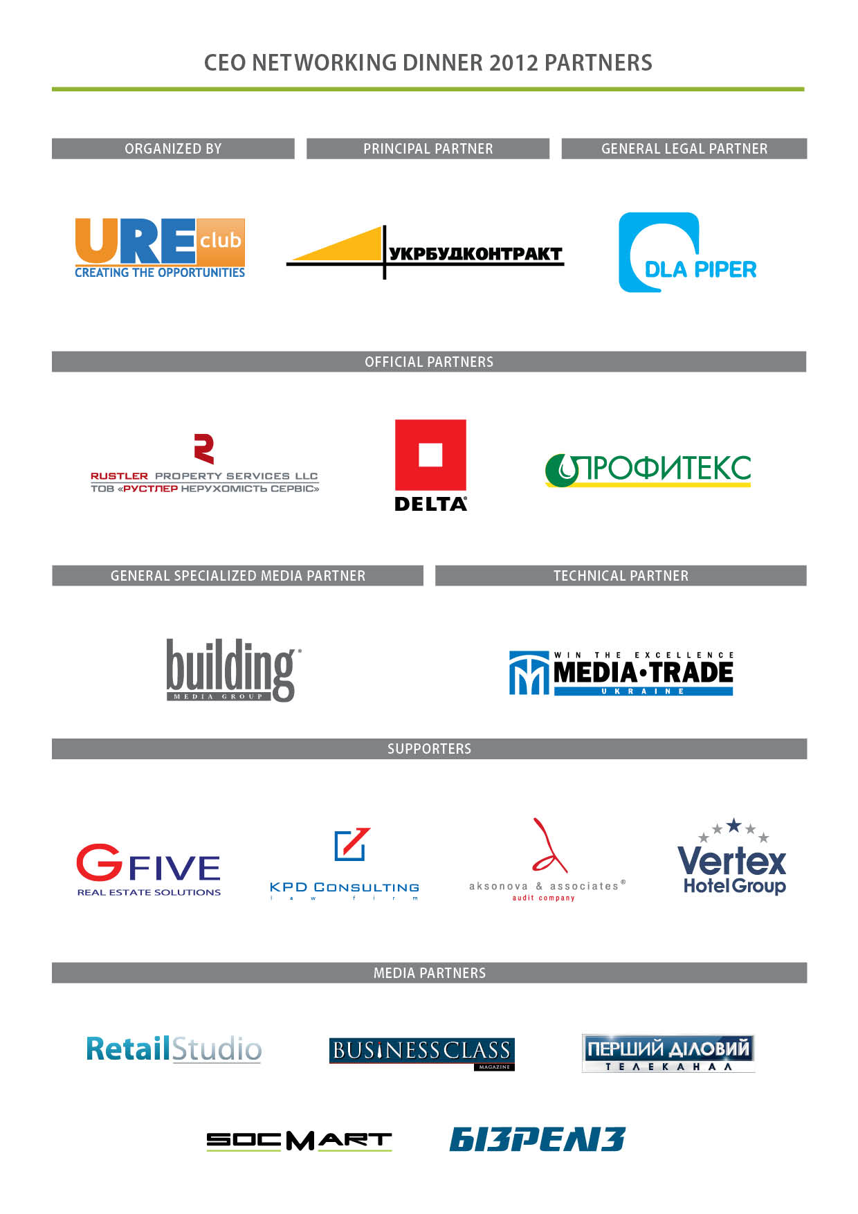 В мероприятии CEO Networking Dinner, организованном Ukrainian Real Estate Club приняли участие топ-менеджеры ведущих отраслевых компаний, эксперты рынка недвижимости, банковских структур и юридических фирм. Спикерами на встрече выступили Алексей Говорун (ТММ), Алексей Евченко (ArtBuild Hotel Group), Анна Духно (Knauf Insulation), Владислав Байрака (Банк Кипра), Вольфганг Гомерник (Delta Projektconsult Ukraine), Даниил Владов (JLL), Доминик Меню (BNP Paribas), Елена Шуляк (Midland Development Ukraine), Игорь Кабузенко (ICON Private Equity Fund), Илья Свердлов (DLA Piper Украина), Людмила Луганова (Хоспитальер Групп), Михаил Артюхов, (ЮЗТС) Наталия Стельмах (DTZ Ukraine), Наталья Кочергина (DLA Piper Украина), Ник Коттон (DTZ Ukraine), Олег Куринной (Dragon Development), Сергей Федорик («Укрбудконтракт»), Станислав Шульга (UaGBC).