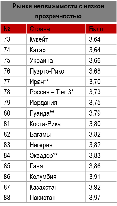 У групах регіонів з низькою прозорістю і непрозорих спостерігається деякий прогрес, проте більшості таких регіонів він дається важко. Зокрема, в список ринків з низькою прозорістю входять Україна (75), регіональні міста-мільйонники Росії (78), за винятком Москви і Санкт-Петербурга, які потрапили в список ринків середньої прозорості, і Казахстан (87). Слід зазначити, що Україна зміцнила свої позиції в рейтингу в тому числі завдяки підвищенню відкритості компаній ринку нерухомості, зокрема, публікації деякими гравцями звітності, і зростання публічності державного сектора в результаті проведених реформ.