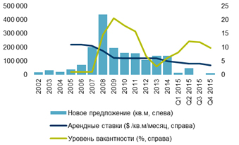 в 2015 году, составил около 160 700 кв.м (GLA), что на 25% ниже показателя 2014 года и на 52% ниже показателя 2013 года.