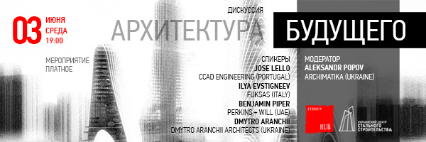 Спикерами мероприятия выступят Бенджамин Пайпер (Benjamin Piper), директор по архитектуре Perkins + Will (ОАЭ), Дмитрий Аранчий, архитектор, основатель Dmytro Aranchii Architects (Украина), Илья Евстигнеев, архитектор FUKSAS (Италия) и Хосе Лелло (Jose Lello), основатель CCAD Engineering (Португалия). Модератор встречи - ведущий украинский архитектор, директор архитектурного бюро «Архиматика», Александр Попов.